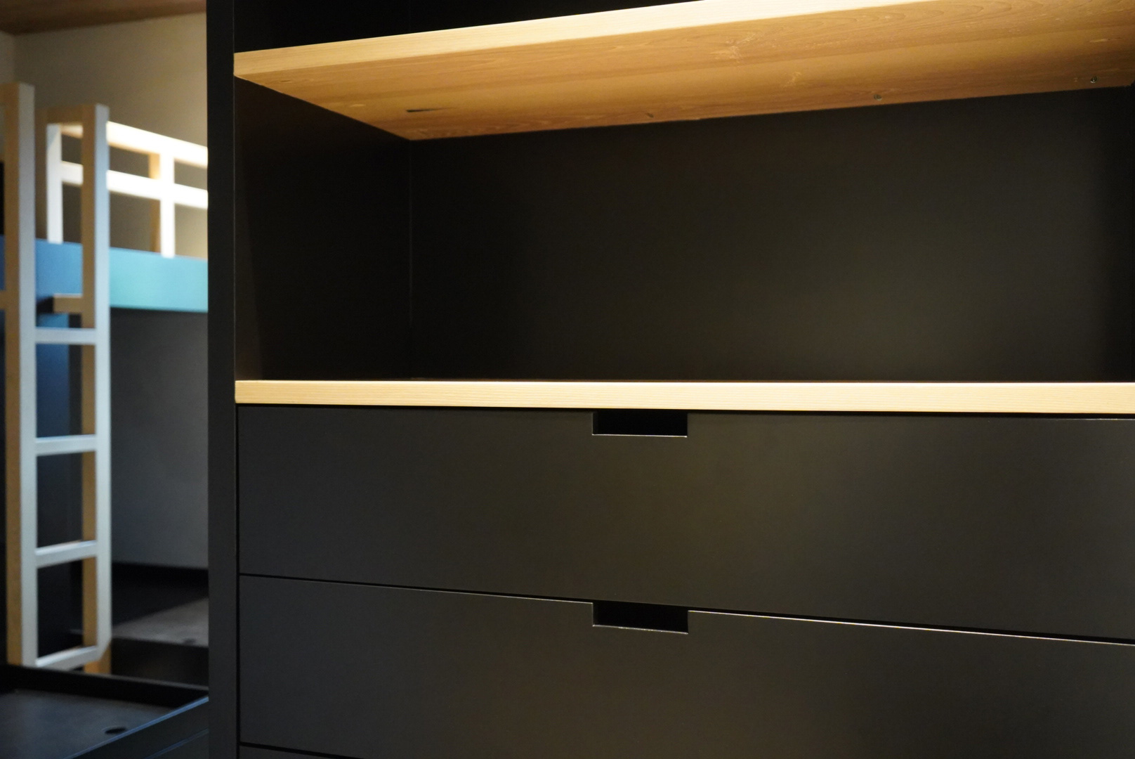 Unveil our Char project, featuring custom-built bunk beds designed for both style and functionality. Each bed includes sturdy ash ladders and guard rails crafted with mortise and tenon joinery, ensuring durability and safety. The integrated dresser and storage solutions maximize space, while the seamless mitred casework adds a polished touch. To complete the look, we’ve installed a stunning glass barn door that enhances the overall aesthetic.