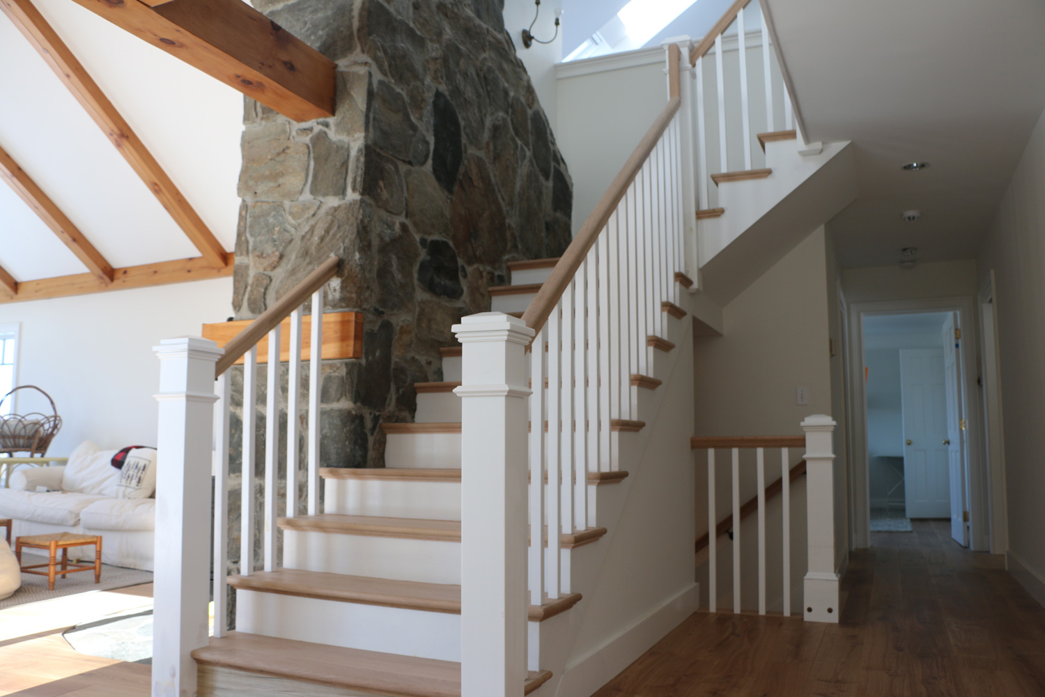 Admire our hand-cut reclaimed timber trusses spanning over 40 feet, elegantly joined with a wedged stop splayed scarf joint. This project also features a traditional white oak staircase, complete with bold newel posts and seamless white oak handrails, meticulously constructed to enhance both aesthetics and functionality.